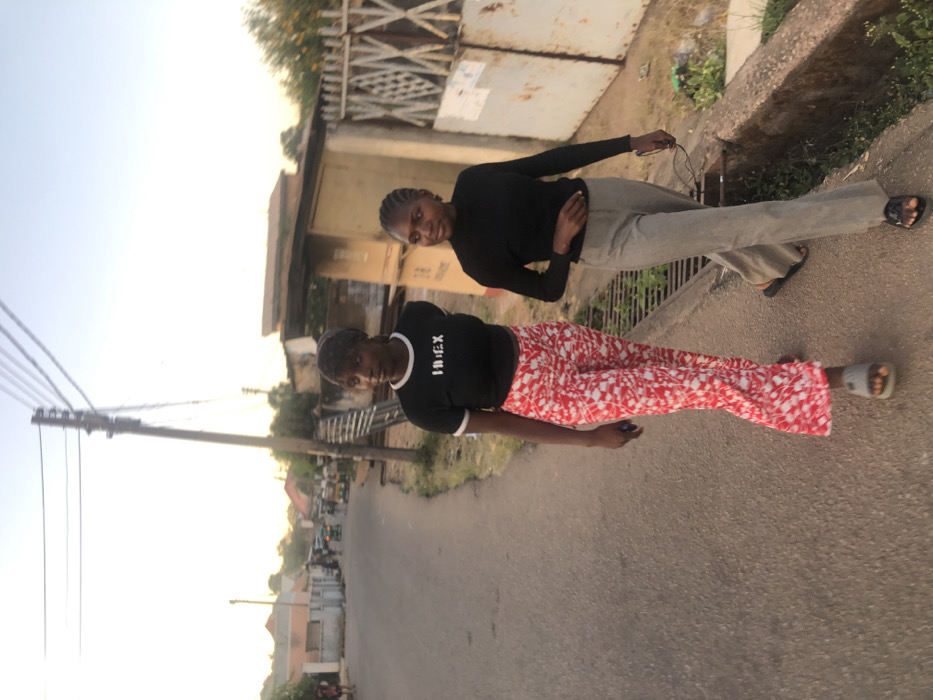 The image depicts two young women walking on a paved road shoulder in a residential or mixed-use area of Jos, Nigeria