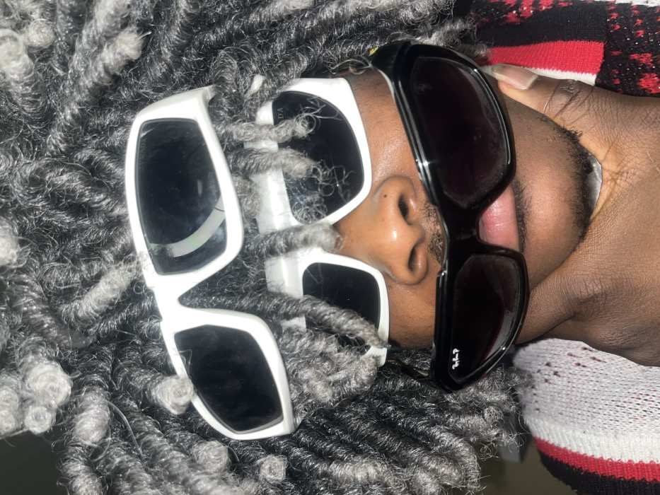 A person with gray dreadlocks wears two pairs of sunglasses