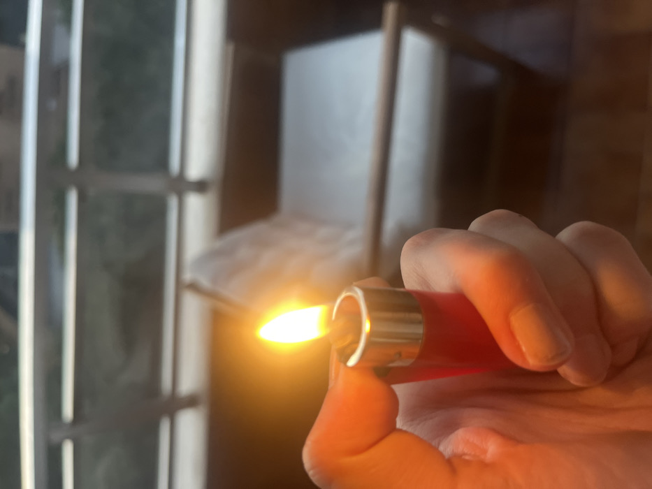 - "A human hand holds a red disposable lighter with an active, bright yellow-orange flame, positioned centrally in the foreground" by FM-mrTCs1, licensed under CC BY 4.0