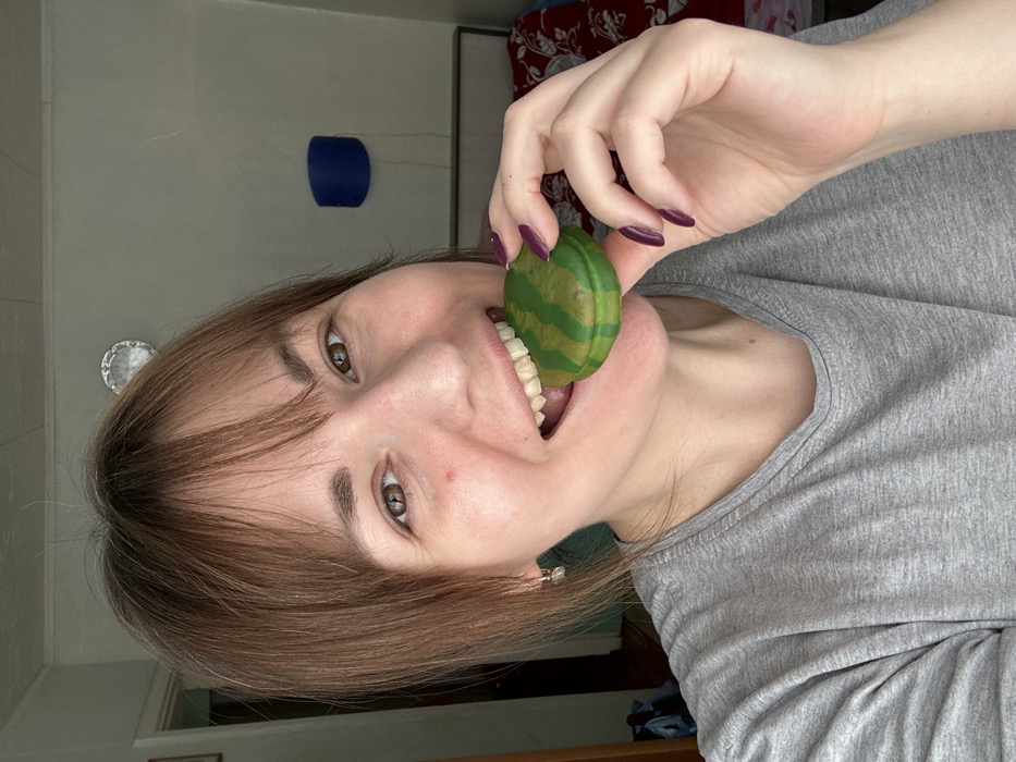 The image portrays an indoor residential scene in the city of Фоки, Russia. A female subject, depicted from the chest up, has shoulder-length brown hair with bangs and light skin. She wears a grey long-sleeved shirt, has small earrings, and dark plum-colored nail polish. The subject is smiling with her mouth open, her upper teeth resting on the edge of a small, round, green object with darker green stripes, consistent with a watermelon pattern. She holds this object in her right hand and looks directly at the camera. The background features a light-colored wall. Visible elements include a bed with a red and white patterned comforter on the right, a dark blue cylindrical object mounted on the wall, a silver-toned decorative object mounted above the subject's left shoulder, and a light-colored doorway on the far left.
