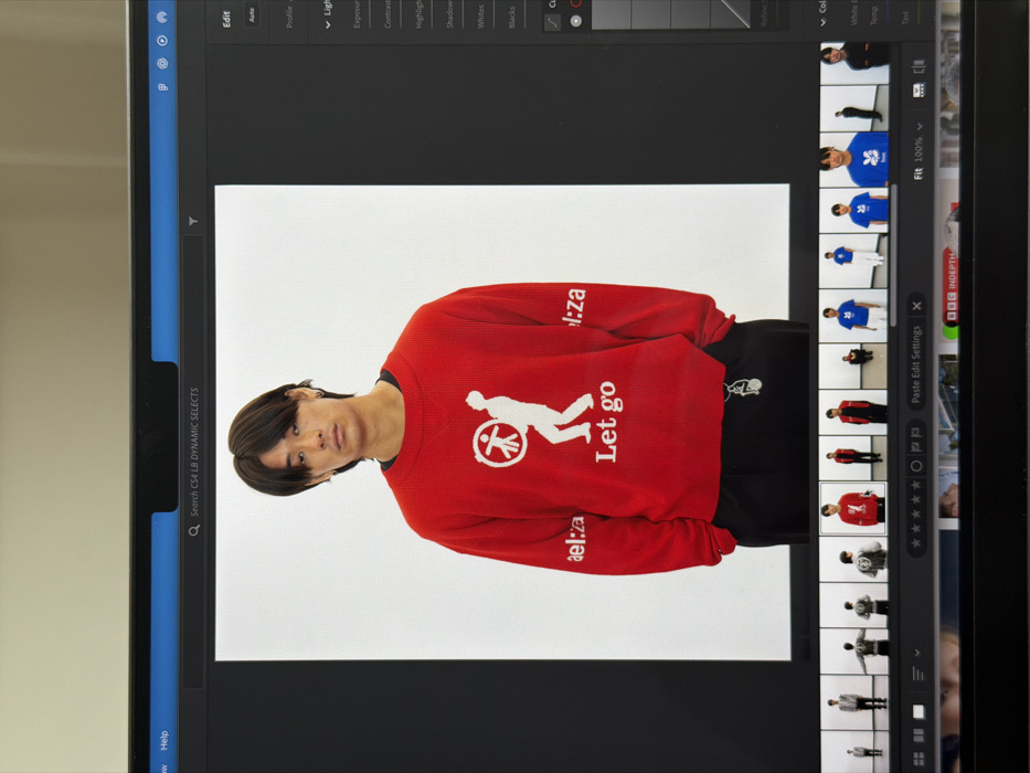 The image displays a computer monitor showing an image editing application, likely Adobe Lightroom Classic. The central focus on the screen is a full-body photograph of a male individual, appearing East Asian, with dark, medium-length hair, wearing small hoop earrings, standing against a plain white background. He is dressed in a red, long-sleeved crew-neck sweatshirt that features a white graphic on the chest depicting a stylized figure with outstretched arms, positioned as if releasing or supporting a smaller, circular, stick-figure-like emblem. Below this graphic, the words "Let go" are printed in white. The text "ael:za" is also visible in white on both sleeves of the sweatshirt. He wears dark trousers, from which a silver-colored charm or chain hangs near his right hip. The monitor's interface shows a top menu bar with "File," "View," and "Help" options, along with a search field labeled "Search CS4 LB DYNAMIC SELECTS." The right-hand panel of the software displays image editing controls under an active "Edit" tab, including "Light," "Exposure," "Contrast," and other adjustment sliders. Below the main image, a filmstrip of thumbnail images shows the same model in various poses and apparel, with the currently displayed red sweatshirt image highlighted. A distinct reflection on the lower bezel of the monitor reveals a "BBC INDEPTH" logo. This BBC branding strongly indicates the location is within London, United Kingdom.