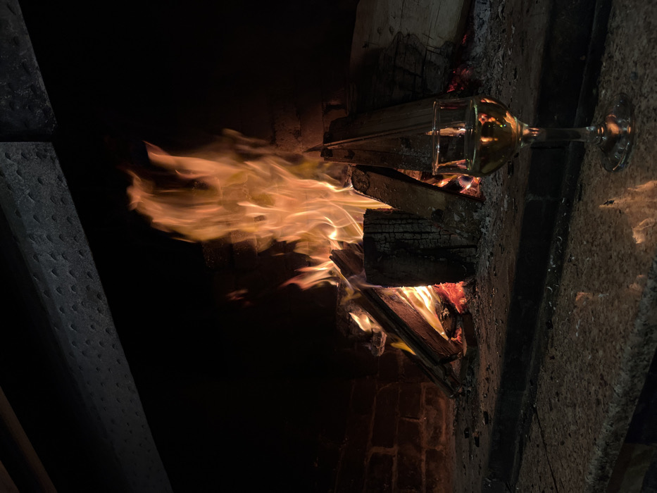 The image depicts a close-up view of a burning wood fire within a brick fireplace, located in the city of Zlatograd, Bulgaria. A clear, stemmed glass containing a pale, yellowish liquid, consistent with white wine, stands on a dark, speckled granite or marble hearth in the foreground, positioned to the lower right. The fire, comprised of several logs, exhibits bright orange and yellow flames rising centrally, casting significant illumination on the surrounding dark brick interior of the firebox. Embers glow red at the base of the fire. The upper portion of the fireplace reveals a dark, textured beam or lintel with a uniform dimpled pattern. The overall environment is dimly lit, with the fire being the primary light source. No individuals are visible.