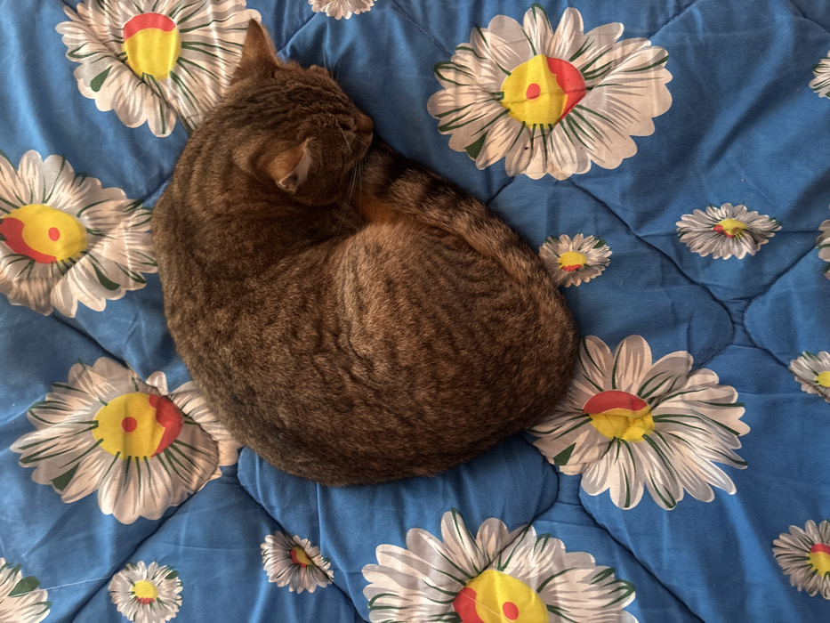 In Kunje, Montenegro, a mottled brown and grey striped domestic cat is observed sleeping, curled tightly into a spherical shape on a quilted blue comforter. The cat's head is tucked inward, and its striped tail is wrapped around its body. The comforter features a repeating pattern of large white daisies, each with a yellow center containing a small red crescent marking.