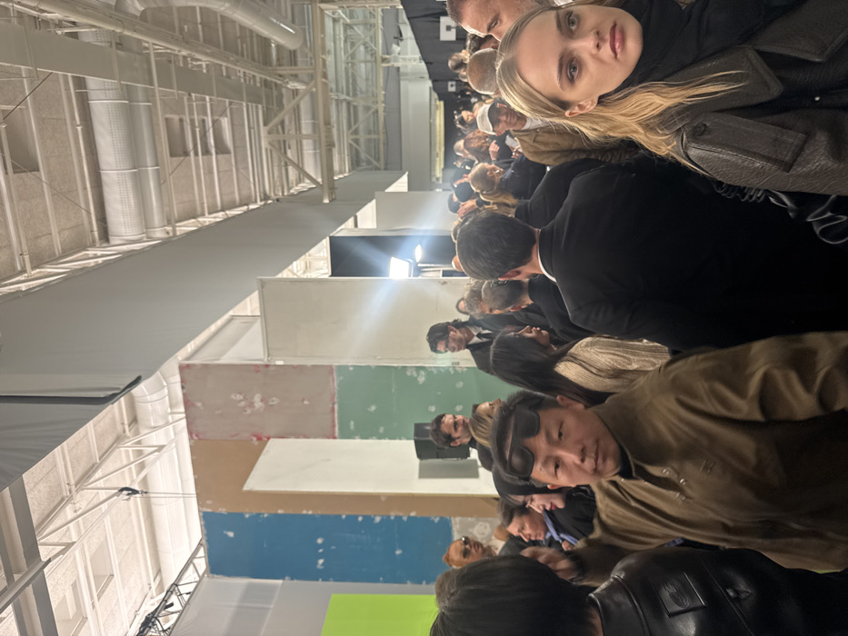 The image depicts a densely crowded indoor event space, characterized by an industrial-style ceiling with exposed white trusses and ventilation ducts, located in Milan, Italy. The background features large, multi-panelled partitions in varying states of finish, displaying colors such as blue, beige, pale pink, white, and a vibrant green section. A black speaker rests on the floor to the left, and a bright stage light illuminates the scene from the right rear. In the immediate foreground, a male of East Asian descent, wearing a brown high-collared jacket and sunglasses on his head, looks directly at the camera. To his right, a blonde Caucasian female, dressed in a dark coat and black scarf, also faces the camera. A person in a black leather-like jacket with a Lacoste logo is partially visible on the far left. The gathered individuals, predominantly adults in various attire including dark suits, suggest attendance at a fashion or cultural event.