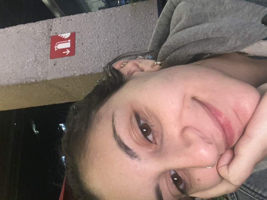 A woman poses indoors with her face close to the camera. She has brown hair and eyes, a nose ring, and multiple earrings. She wears a gray hooded sweatshirt. Part of a wall with a sign depicting a white fire extinguisher pointing to the right is visible above her. A dark area with indistinct light sources is visible above the wall.
