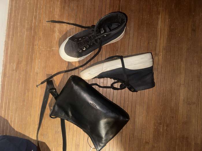 The scene depicts a wooden floor in Nanterre, France, serving as the ground for several personal items. The floor consists of light brown, vertically aligned planks. Two dark-colored, high-top canvas sneakers with white rubber soles are present. One sneaker is positioned towards the upper-right, with its toe pointing upwards and to the left; its black laces are untied and extend across the floor. The second sneaker is located towards the center-right, oriented with its toe pointing downwards and to the left; its black laces are also untied and spread. A black, unstructured shoulder bag or messenger bag made of a material resembling leather is situated in the lower-center, with its strap extending towards the upper-left, partially overlapping the laces of the second sneaker. A small, dark blue fabric object is partially visible in the lower-left corner of the frame. The items appear to be casually placed or discarded on the floor.