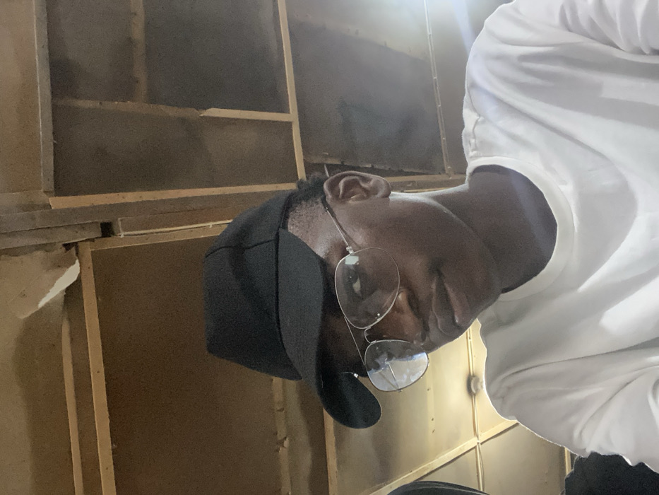 An individual, wearing a black cap and glasses, is seen in the lower right corner of the frame. They have dark skin and are wearing a white shirt. The background features a rough, unfinished wall constructed from what appears to be unfinished wood panels, arranged in a grid-like pattern. The lighting in the room appears to be coming from the upper right, casting a bright glare. The overall composition suggests a casual, unfiltered snapshot in an indoor environment under renovation.