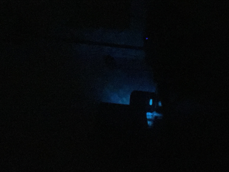 In an almost entirely dark frame, a silhouette of a car is barely visible on the right side of the image. Faint blue light emanates from the car's headlights and reflects off the ground. A thin, dark line extends horizontally across the upper portion of the photo, with a subtle blue glow behind it. A small blue dot is present above the car.