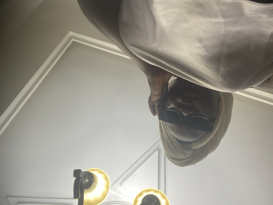 An upside-down view shows a person wearing sunglasses and a towel on their head. They lean towards the camera from above. A ceiling with white trim is visible in the background. Two sconce-style lights with gold-colored shades are in the lower portion of the frame. The person is positioned slightly to the right. The overall tone is neutral, with the main focus on the individual's face and upper body.