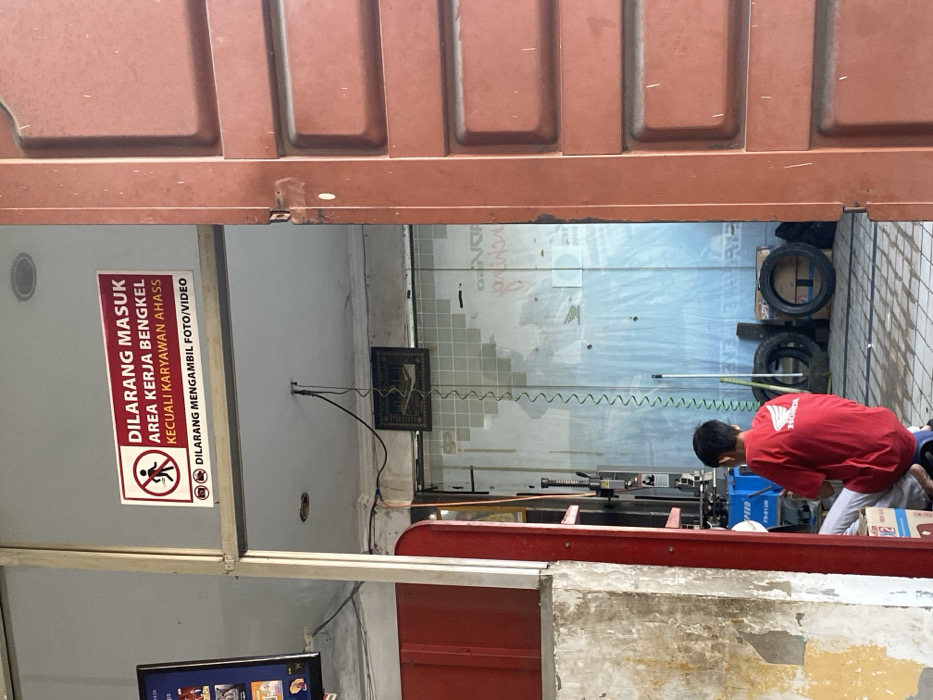 The image depicts the interior view of a workshop, likely an automotive service center, located in Teupinbatee, Indonesia