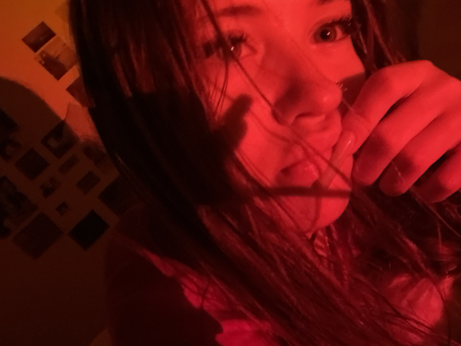 The scene depicts a close-up, angled portrait of an individual in an indoor setting, heavily illuminated by a strong red light source. The subject, appearing to be female, is positioned with her head tilted. The right side of her face (viewer's left) is prominently visible, including an open eye with a discernible pupil and iris, and the bridge of her nose leading down to her mouth area. Long, dark hair cascades across the frame, partially obscuring the left side of her face (viewer's right) and flowing into the upper and lower left quadrants. A hand is visible in the lower right portion of the image, with fingers partially curled, positioned near the lower part of the subject's face or chin. In the upper background, behind the subject's head, a wall or vertical surface is visible, adorned with multiple dark, square-shaped objects, possibly photographs or small frames, arranged in an irregular pattern. The pervasive red lighting limits color perception and deepens shadows, creating a low-light environment beyond the directly illuminated subject. The specific location within Raanana, Israel, cannot be determined from visual evidence in the image.