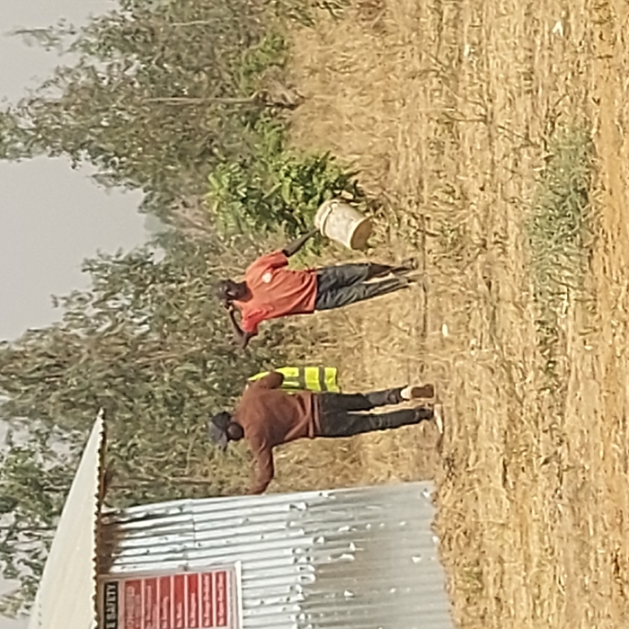 Two men stand in a field. One wears a red shirt and dark pants, holding a bucket. The other wears a brown jacket, black pants, and a yellow safety vest. A corrugated metal structure stands nearby, with a sign in red and white. Trees and dry grass fill the background.