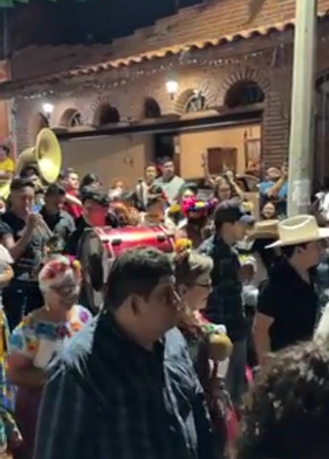 A festive parade progresses down a narrow street at night. The crowd is densely packed, with people of all ages dressed in everyday attire, as well as traditional floral headdresses and brightly colored clothing. A brass band accompanies the group, with visible instruments including a tuba, trumpet, and drums. Colorful triangular pennant flags are strung across the street above the crowd. The buildings lining the street are made of brick and have archways. The parade is lively and spirited.
