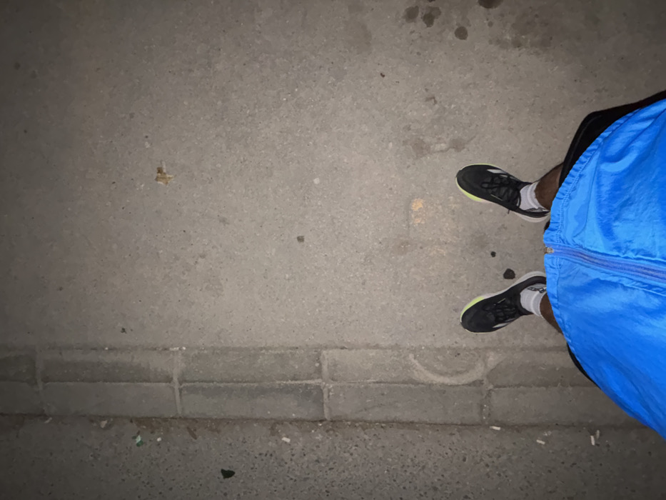 An aerial, downward perspective depicts the lower torso and legs of an individual standing on an urban ground surface in Varna, Bulgaria. The person wears black athletic shoes with prominent neon yellow-green soles, white ankle socks, dark shorts, and a blue zippered windbreaker or jacket. The ground is bisected vertically by a distinct concrete block curb. To the left of the curb, the surface is a darker, rougher asphalt or concrete, containing scattered small debris, including white fragments consistent with cigarette butts and dark specks. To the right, the surface is a lighter, smoother asphalt, exhibiting various dark stains and minor detritus like a small brown leaf. The scene is illuminated by ambient, low-level lighting.
