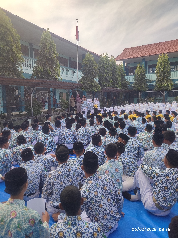 A large group of students, mostly wearing patterned shirts and black caps, are seated on a blue surface outdoors. Some students in white hijabs and yellow tops are visible further back. Several adults are standing in front of the group. A flag pole with a flag is visible in the background. The setting appears to be a schoolyard with trees and buildings in the distance. The date "06/02/2026" and time "08:56" are displayed in the bottom right corner.