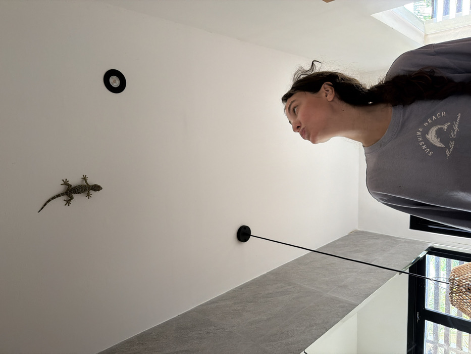 A woman gazes at a gecko on a white wall