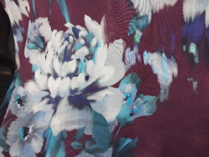 This image presents a close-up, angled view of a floral-patterned textile fabric, located in Barden Yana, Nigeria. The fabric's background is a solid deep maroon or burgundy. Overlaying this background are large, abstractly rendered floral designs, primarily in shades of white, light blue, and teal. Darker blue and purple tones are integrated into the blossoms and foliage, with sporadic subtle green specks also visible within the pattern. The floral elements exhibit a soft, impressionistic style with blurred edges, resembling brushstrokes. No individuals, actions, interactions, or additional objects are present within the visible frame. The immediate environment surrounding the fabric is not discernible.