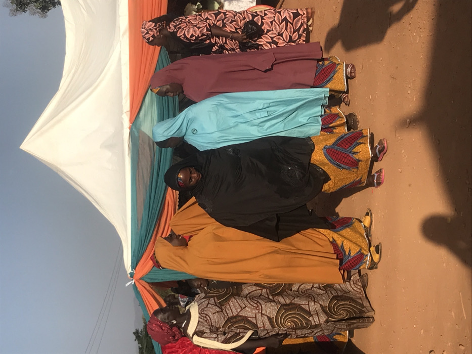 A group of women stand in a row, dressed in traditional attire. Each woman wears a colorful, flowing robe and a head covering in a different shade, ranging from brown to red, black, and orange. They are positioned near a decorated tent, with layers of white, orange, turquoise, and other colors creating a festive backdrop. The women's vibrant outfits stand out against the outdoor setting.