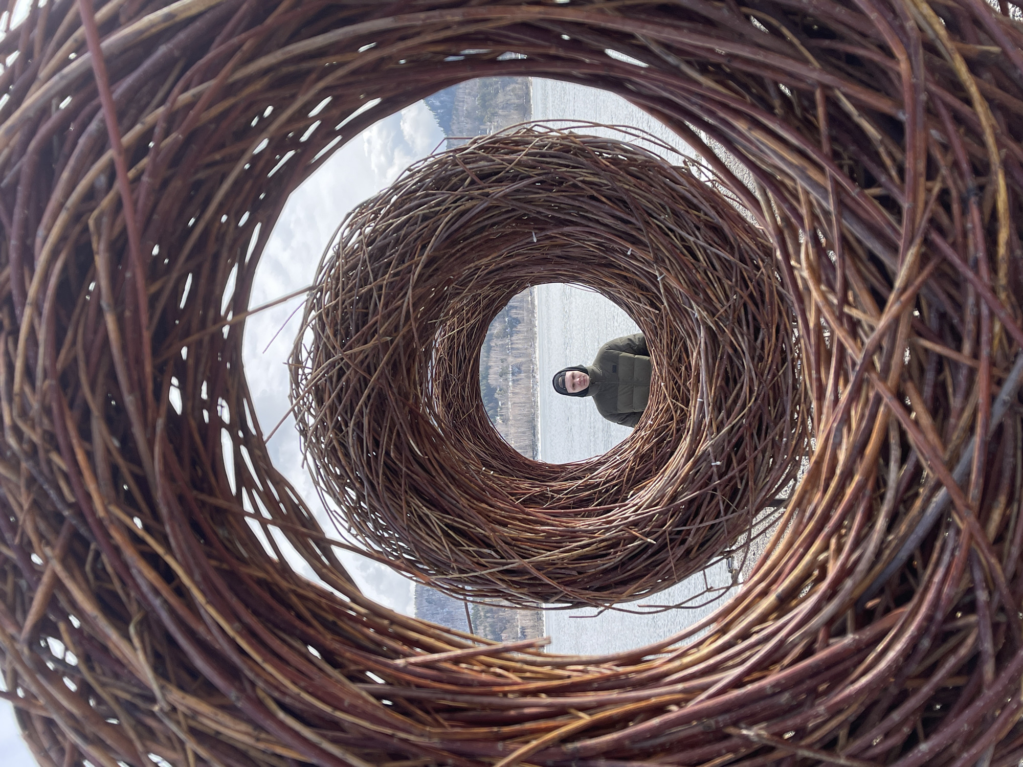 An outdoor scene on Tatyshev Island, Krasnoyarsk, Russia, features a prominent, circular art installation constructed from interwoven dark reddish-brown branches. A single male individual, wearing an olive-green hooded puffer jacket and a dark baseball cap worn backward, stands centered within the installation's circular aperture, directly facing the viewer. Beyond the aperture, the wide, grey-blue surface of the Yenisei River is visible under an overcast sky. The distant riverbank consists of forested hills with dormant or bare trees and visible patches of snow. The ground in the foreground immediately surrounding the installation is composed of light-colored gravel or dirt. A partial view of a second, similar woven structure is observed to the right of the main installation.