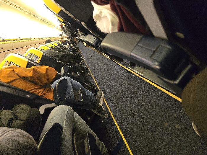 An angled view inside an airplane cabin shows rows of seats occupied by passengers. Predominantly, the seats are dark with yellow headrests. People are seated with their legs partially visible in the aisle. The floor is dark gray with a bright yellow stripe defining the aisle. The perspective is tilted, focusing on the seats and passengers within the compact space.