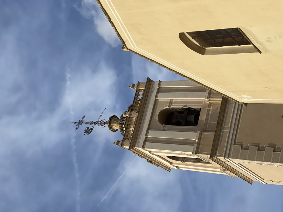 The image displays an upward-angled view of a historical architectural structure located in Paiporta, Spain. The primary subject is a multi-tiered bell tower constructed from light beige masonry or stucco, featuring lighter, contrasting vertical pilasters and horizontal bands. The belfry section, located in the upper half of the tower, exhibits arched openings, within one of which a dark-colored bell is visible. Above the belfry, the tower is capped by an ornate, possibly tiled, dome-like structure, upon which a metal weather vane assembly is mounted. This assembly includes a decorative cross, a rooster or similar animal figure, and directional pointers, topped by a slender spike, likely a lightning rod. Adjacent to and to the right of the bell tower, a segment of an adjoining building is visible. This structure matches the light beige color of the tower and presents a sloped roofline with a thin white trim. An arched window with dark, slatted shutters is set into this wall. The sky, serving as the background, is partly cloudy with patches of clear blue, and at least two distinct white contrails from aircraft are visible traversing the upper left quadrant. No individuals or active interactions are present in the frame. The scene is illuminated by natural daylight, casting subtle shadows that define the architectural elements.