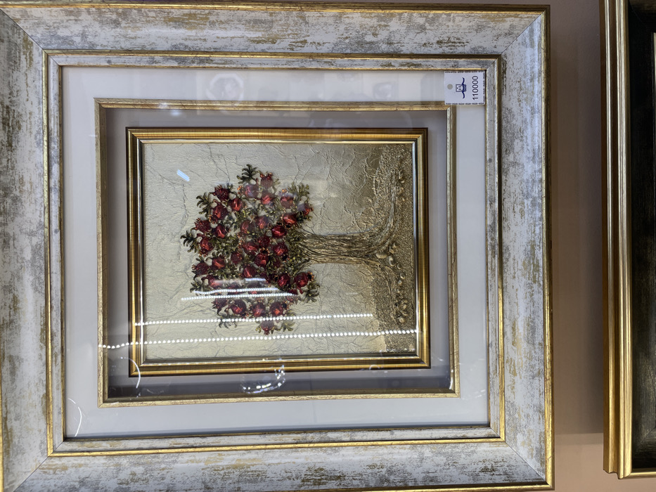 A vertically oriented image captures a framed mixed-media artwork displayed indoors, likely within a retail or gallery setting in Yerevan, Armenia