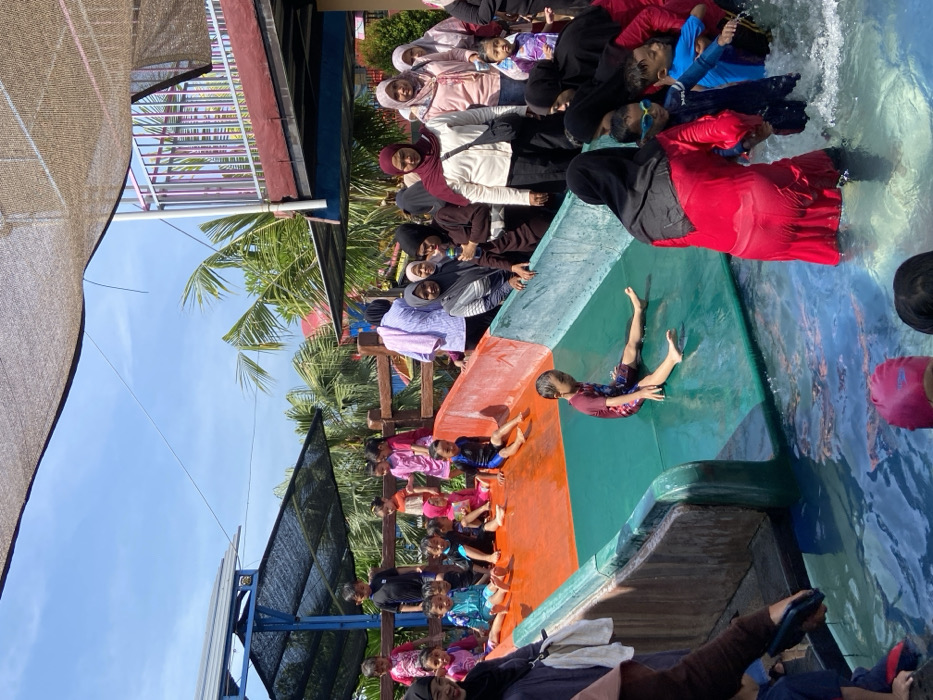 A vibrant scene unfolds at a water park. A diverse group, many wearing hijabs, watches children gleefully sliding down a colorful water slide. The slide transitions from orange to green before ending in a pool. Bright sunlight illuminates the scene, reflecting off the water's surface. Lush green trees and a blue sky fill the backdrop, adding to the lively atmosphere.