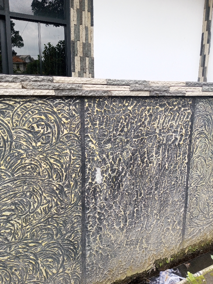 The image displays a section of a building's exterior in Vieng Phouka, Laos. The lower portion of the wall features a dark grey rendered surface with raised yellowish-cream textured patterns. The left and partially visible right panels exhibit intricate, swirling, and organic relief designs. The central panel showcases a highly irregular, rough, and somewhat cracked-appearing texture, also in yellowish-cream over dark grey, with a small, irregular white patch near its upper center. A horizontal band of stacked, rectangular stone veneer in varying shades of grey and beige separates the lower textured wall from the upper structure. Above this band, the wall on the right is plain white. On the upper left, a dark-framed window reflects overhead clouds, green tree foliage, and a distant building with a reddish roof. Vertical strips of similar stacked stone veneer flank the window and extend upwards. At the very bottom of the image, directly beneath the textured wall, a narrow, dark ground channel is visible, containing some small green plants and a piece of discarded white plastic material. The lower edge of the textured wall shows discoloration and apparent accumulation of dirt or moisture. No people, specific actions, or interactions are present in the static scene.