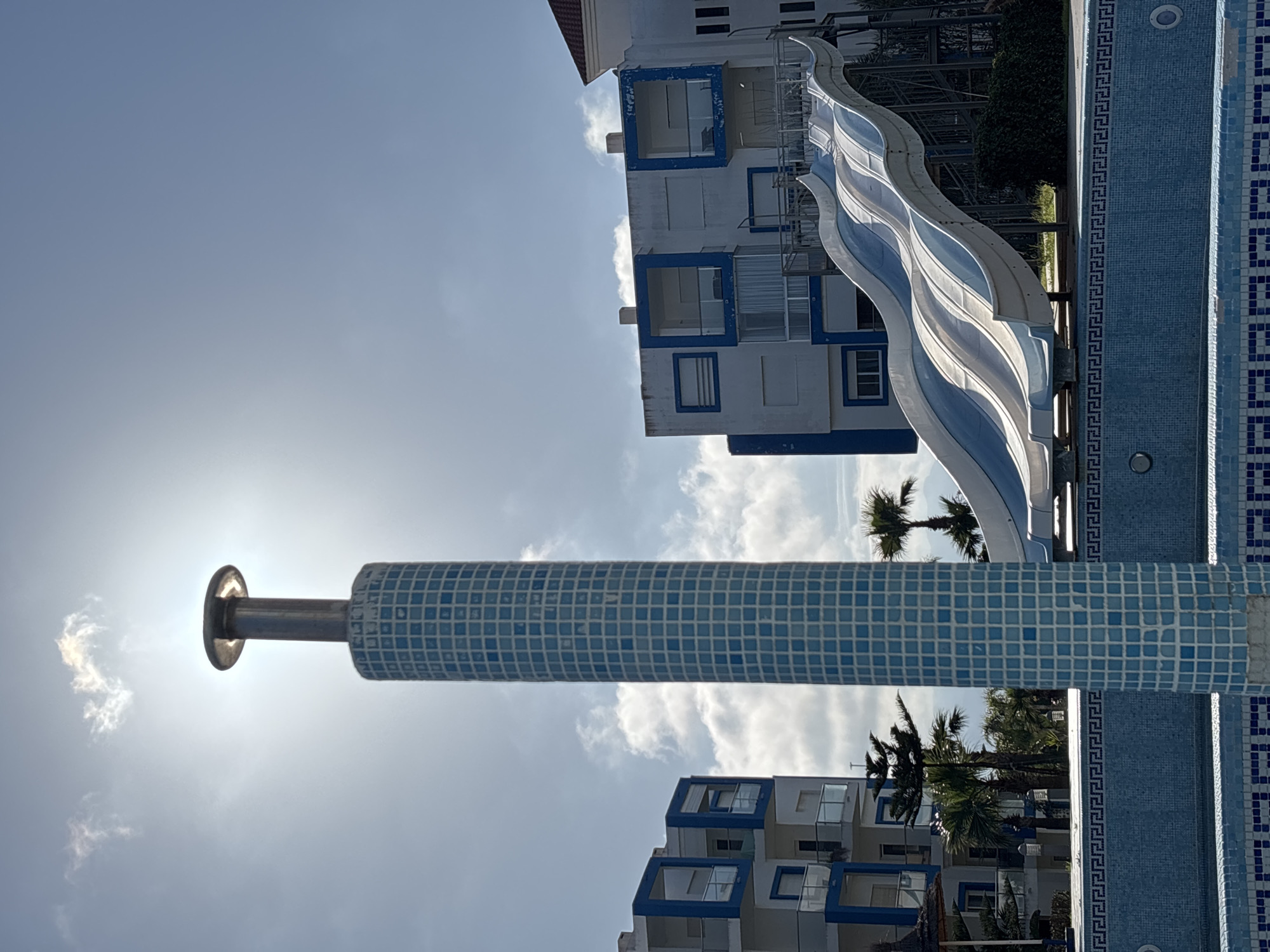 This image depicts an outdoor leisure area in M'Diq, Morocco, characterized by a swimming pool complex. In the immediate foreground, an empty swimming pool with light blue and white mosaic tiling and a dark blue Greek key pattern border is visible. A tall, cylindrical pillar, also clad in light blue and white mosaic tiles, stands prominently in the center-left, topped with a metallic light fixture silhouetted against the bright sun. To the right of the pillar, a multi-chute water slide, predominantly white with blue accents, descends towards the pool area, supported by a metal framework. Behind the water slide and extending to the left, two multi-story buildings are present. These structures feature white facades with distinctive blue-framed balconies, some equipped with glass railings. Sparse vegetation, including palm trees and conifers, is interspersed between the buildings and the pool area. The sky is bright with a mix of clear blue and scattered white clouds, and the sun's position directly behind the central pillar creates a strong backlighting effect. No individuals are present within the scene.