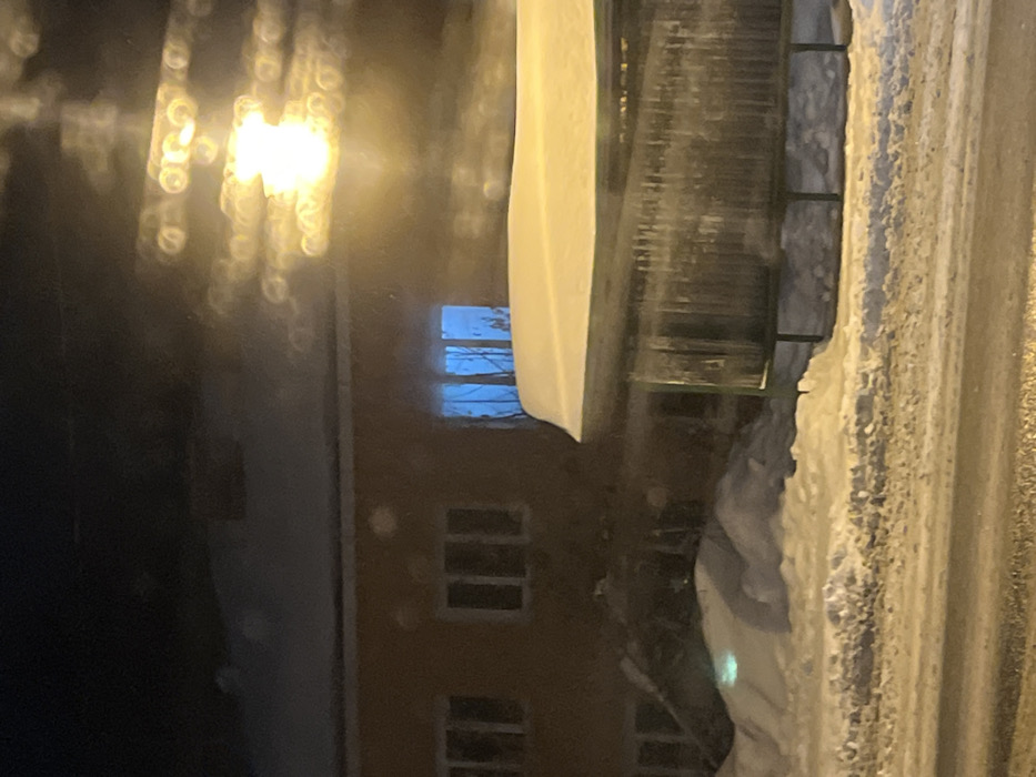 The image depicts a nighttime winter scene in Shevlyakovo, Russia. In the background, a two-story building, light brown or terracotta in color, occupies the left and central portion. Multiple rectangular windows are visible on the upper and lower floors. One window on the upper floor, positioned towards the right, emits a distinct blue light, revealing bare tree branches through it. The building's roof is flat and covered with a thick layer of snow. In the mid-ground, to the right, a structure resembling a bus stop or public shelter is present. Its flat roof is heavily covered by a deep accumulation of snow, appearing rounded. The sides of this structure are made of a transparent or translucent material, possibly glass or plastic, showing vertical streaks and some accumulation, supported by dark framing. No visible occupants are present within the shelter. The foreground consists of a snow-covered environment. A paved surface, likely a road or street, spans the bottom of the frame, showing dark streaks consistent with vehicle traffic or slush. Significant snowdrifts line the edge of this paved surface and extend towards the buildings, varying in height and form. An intense, diffused yellow-orange light source, likely a streetlamp, is present in the upper right quadrant of the image, causing substantial lens flare and circular bokeh effects across the upper and right portions of the frame. The overall scene is devoid of people or overt activity.