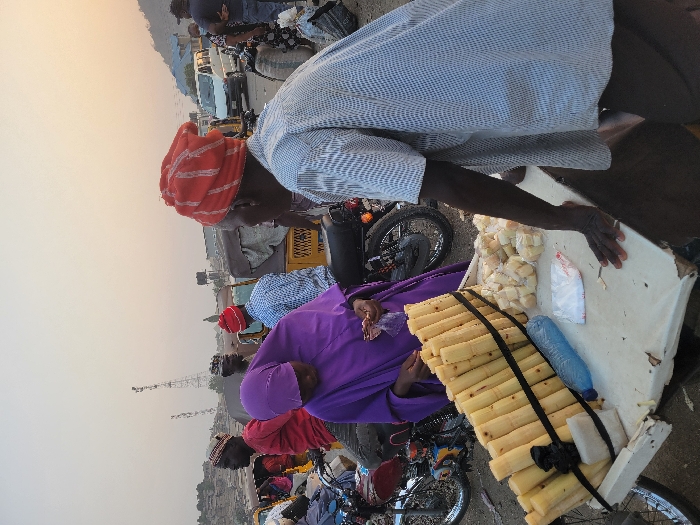 A vibrant outdoor market scene unfolds with individuals selling goods. A man in a blue and white striped shirt and red head covering stands near a cart laden with sugarcane and bread. A woman in a purple garment is also present. The cart, with its white surface, displays the wares for sale, including a blue water bottle. Motorbikes and other vendors are visible in the background, contributing to the bustling atmosphere. In the distance, a glimpse of buildings and towers suggests an urban setting.