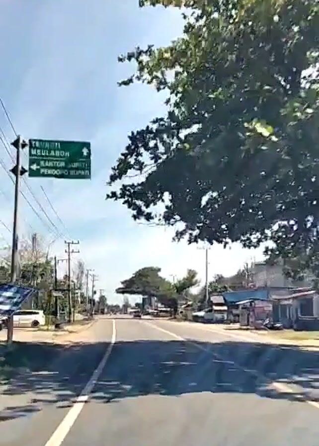 A vehicle is moving down a two-lane road with a yellow centerline. The sky is blue with scattered clouds. Utility poles line the road, carrying power lines. A large tree with dense foliage grows on the right side of the road. A car passes the vehicle from which the video is being shot. Buildings and smaller trees are visible in the background.