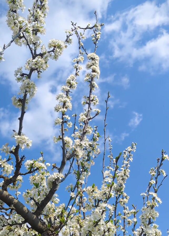 The video presents a low-angle shot of a blossoming tree against a bright blue sky interspersed with scattered white clouds