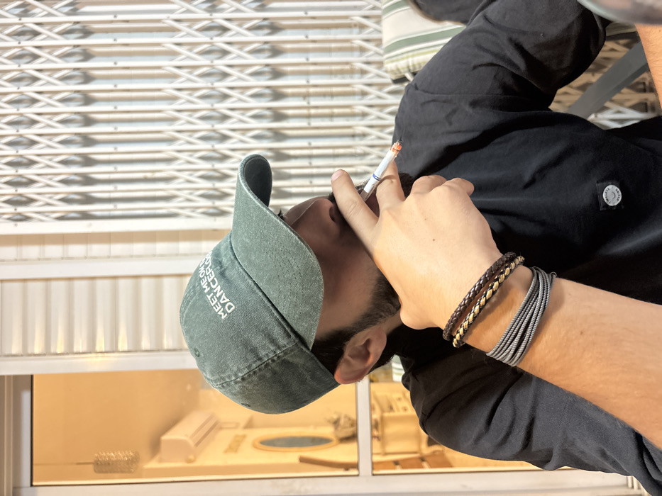 The image depicts a male individual from the chest up, located in Beit Dagan, Israel. The subject wears a dark green baseball cap with "MEET ME ON THE DANCEFLOOR" embroidered in white text, and a black short-sleeved t-shirt. His left wrist is adorned with two braided bracelets, one dark brown and one tan/gold, alongside a multi-strand grey cord bracelet. The individual is holding a lit cigarette to his lips with his right hand; the tip of the cigarette is glowing orange. The background to the left features a reflective glass door or window, revealing an interior space illuminated with warm yellow light, including a white air conditioning unit, a circular wall decoration, and a hanging pendant lamp. To the right, a white accordion-style security gate is visible, with a striped cushion from a chair or bench partially seen behind it.