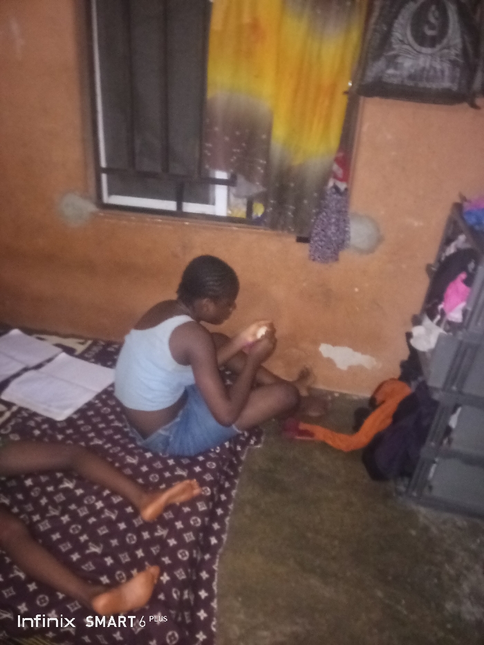 A young person sits cross-legged on a patterned blanket-covered floor, wearing a light blue tank top and denim shorts. They appear to be eating. To the left, notebooks or papers lay on the blanket. A window with bars and a partially drawn curtain hangs above. Beside the person, clothes are scattered on the floor next to a wire shelving unit. The room has orange-painted walls and a bare concrete floor. "Infinix SMART 6 PLUS" is visible in the bottom left corner of the image.