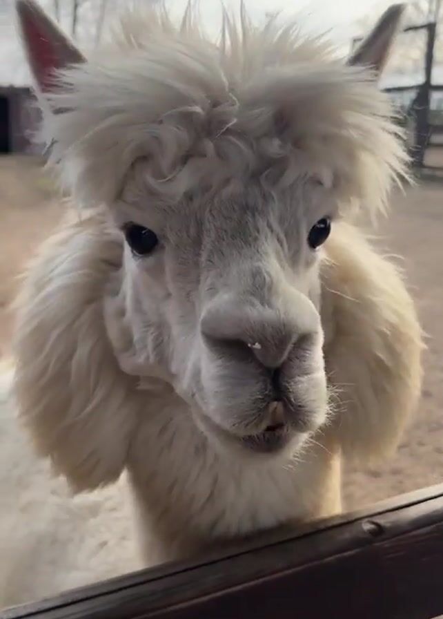 close-up of a white alpaca with a shaggy hairstyle, standing at a fence in an outdoor enclosure