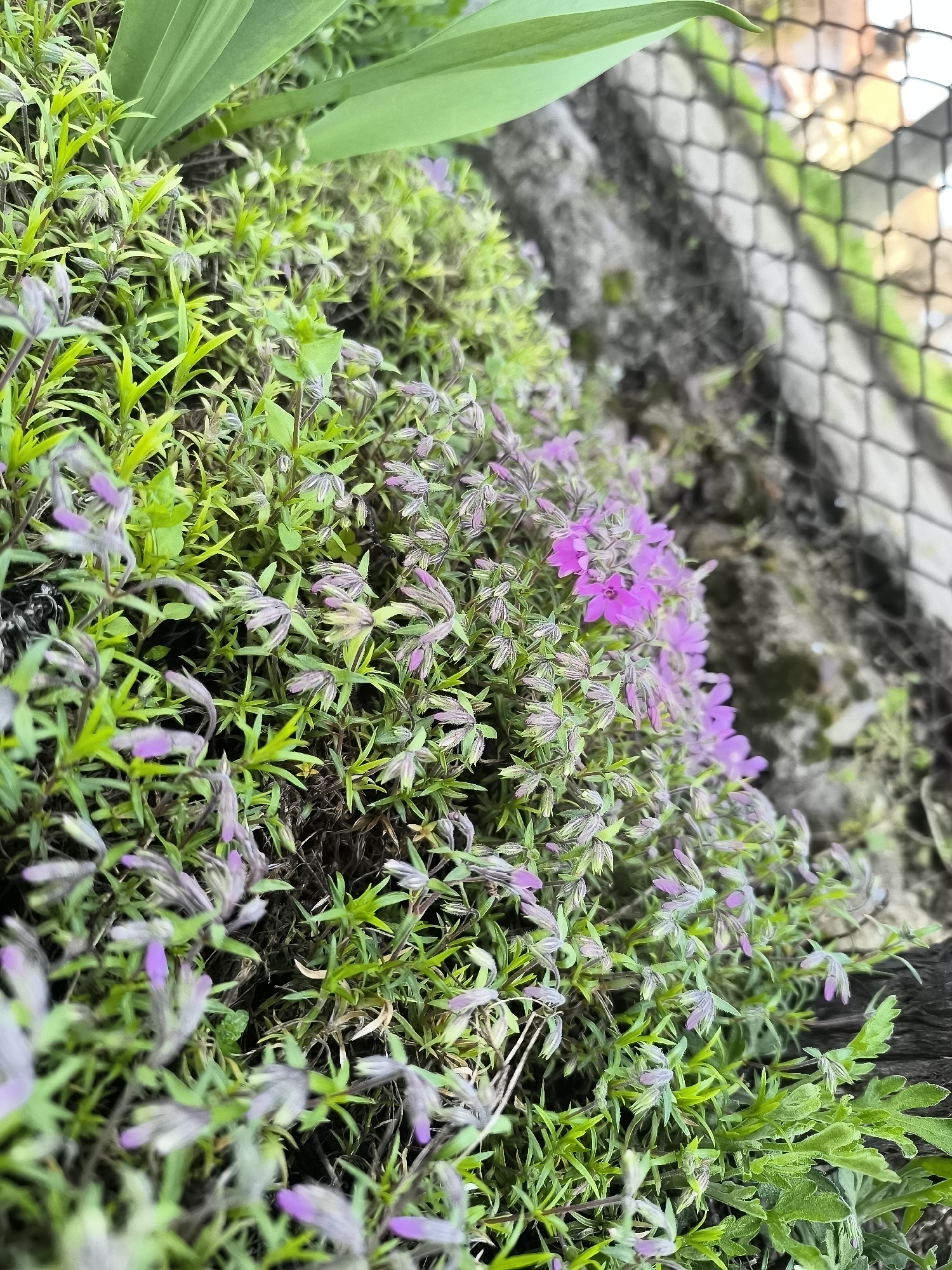 The image depicts a close-up view of flowering plants growing near a fence, likely in a garden or cultivated area. The main plants appear to be creeping phlox (Phlox subulata) or a similar species, characterized by their dense, mat-forming habit and small, needle-like leaves. Some flowers are in bloom, displaying a vibrant pink color, while many others are still in bud. The plants are interspersed with other greenery, including some larger leaves that might belong to a different plant species. In the background, there is a concrete retaining wall or similar structure with a section of chain-link fence visible. The setting is likely outdoors in a garden or similar landscaped area within the city of Gulyantsi, Bulgaria. There is no evidence of human presence, action, or interaction in the scene.