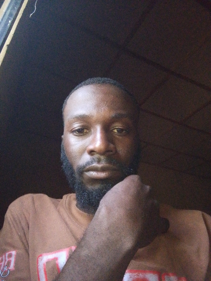 A portrait-style image depicts an adult male of dark complexion, facing forward and looking directly at the camera