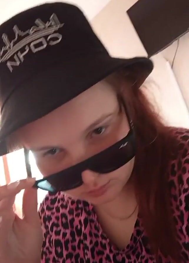 A woman with auburn hair is posing for the camera. She is wearing a pink and black animal print shirt, a black bucket hat with white writing, and black sunglasses. She holds the sunglasses in her hand and moves them up and down her nose. She makes a kissing face at the camera. A man's face appears in the background briefly. The video appears to be taken indoors in a bedroom with a TV on the wall and a curtain.