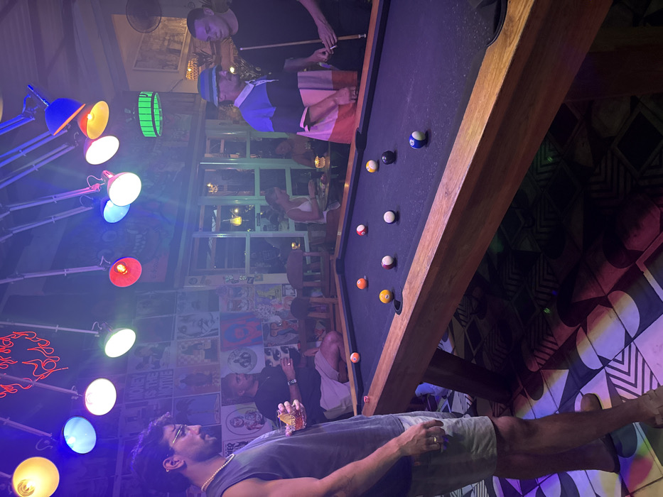 An indoor bar or lounge in Uluwatu, Indonesia, is depicted at night, illuminated by diverse colorful overhead lights, including spotlights in red, blue, green, white, and yellow, along with a red neon flame sign. A central wooden-framed pool table with dark blue felt occupies the midground, featuring multiple pool balls scattered across its surface: solids (orange, red, purple, green, blue), stripes (orange, red, purple, black), a white cue ball, and a black ball. A small red die rests on the table's wooden edge. In the left foreground, a man with dark hair, a beard, and glasses wears a dark sleeveless top, light shorts, and flip-flops. He holds a cocktail with an orange slice in a clear glass and faces slightly right, looking towards the pool table. In the midground, left, another man with a beard, wearing a dark t-shirt and light shorts, is seated at a wooden table holding a drink. To the right of the pool table, two men stand. One wears a blue, pink, and white striped polo shirt and a light-colored bucket hat, looking forward. The other, with dark hair and a black t-shirt, holds a pool cue vertically. In the background, two women are seated at wooden tables, with one woman in a white top looking down at her table. The walls are densely covered with an eclectic mix of posters and art prints, some featuring text like "MONEY IS THE MOTIVE." The floor is tiled with a geometric pattern of black and white shapes, reflecting the colored lights. A black wall-mounted fan is visible in the upper right. The scene suggests a casual social gathering centered around a game of pool.