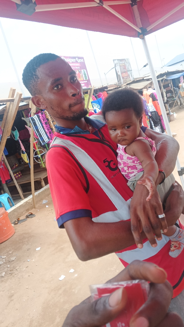 The image portrays an outdoor street market scene in Onitsha, Nigeria, beneath a red canopy. An adult male, with dark skin, short dark hair, and stubble, is positioned centrally. He wears a red polo shirt featuring blue trim, grey reflective stripes, and a "5G smart.c" logo. He holds an infant with dark skin and dark, curly hair, dressed in a pink patterned sleeveless top, light-colored bottoms, and grey socks adorned with a lion design. The baby's left arm is extended. The man wears a silver ring on his right ring finger and maintains eye contact with the camera. The background shows market stalls constructed from wooden frames, displaying various hanging textiles, bags, and other merchandise. A blue plastic stool and slippers are visible on the left. Two advertising signs are present, one a purple sign reading "Designer Luxe." The ground consists of bare earth with scattered white debris. In the immediate foreground, a hand, presumably belonging to the photographer, holds a red, plastic-wrapped rectangular object.