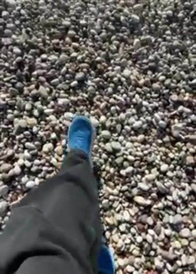 person walking on a pebble beach towards the ocean. The person is wearing blue shoes and black pants. The beach is covered in smooth, gray pebbles. The ocean is visible in the background, with small waves breaking on the shore. The sky is blue and the sun is shining.