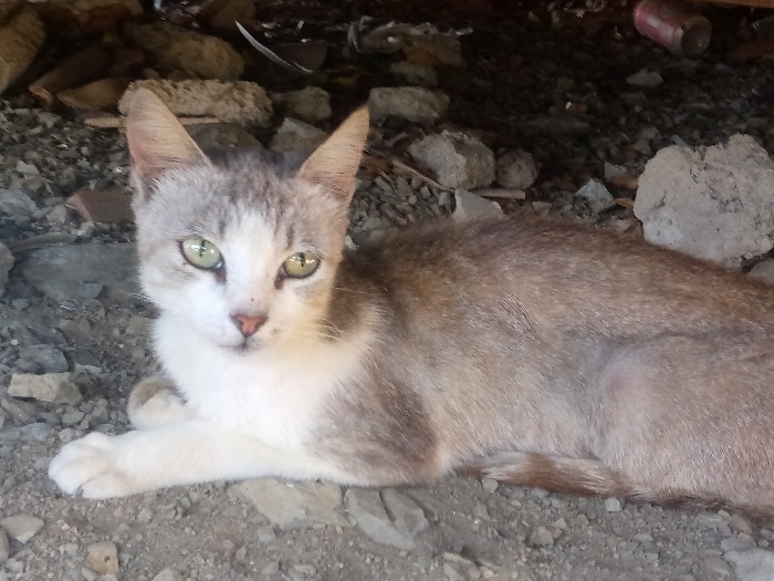 - "A domestic short-haired cat is observed resting on a rough, unpaved ground surface consisting of soil, various sizes of gravel, and fractured concrete pieces" by FM-Q5qB73, licensed under CC BY 4.0