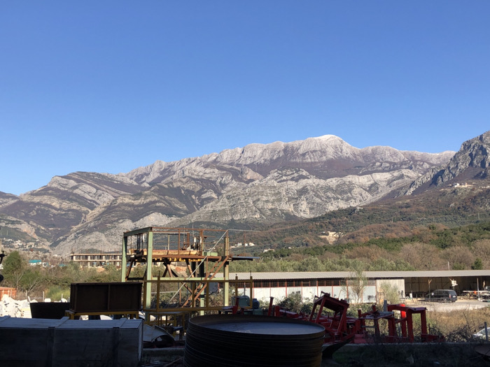 The image presents an outdoor industrial area in Tomba, Montenegro, framed by a prominent mountain range under a clear blue sky