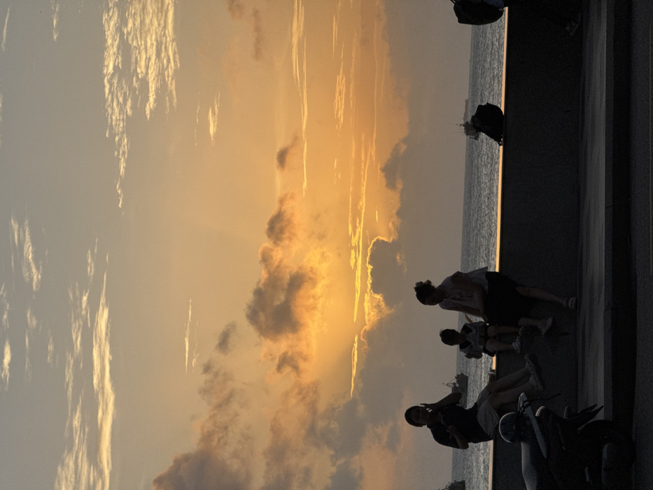 The image depicts a waterfront scene at sunset in Ho Chi Minh City, Vietnam, likely along the Saigon River's embankment in District 1. The sky dominates the upper two-thirds, displaying warm orange and yellow hues from the setting sun, which is obscured by dark, broken clouds near the horizon, casting crepuscular rays. The clouds reflect the sun's light, showing shades of orange, grey, and white. In the foreground, a low, dark concrete barrier or wall runs horizontally, separating a paved area from the water. Three individuals are silhouetted as they sit atop this barrier, left of center. The leftmost figure, appearing adult, holds a phone to their ear or mouth. A small child sits to their right, and another adult is seated further right. All three are facing towards the water and the sunset. A fourth, partially visible silhouetted figure is present on the far right edge of the frame. A dark-colored scooter is parked on the paved surface in the extreme lower-left foreground. The water surface, visible beyond the barrier, is dark and appears calm, reflecting the dim light. Several large cargo ships or industrial vessels are discernible as dark silhouettes in the mid-distance on the water.
