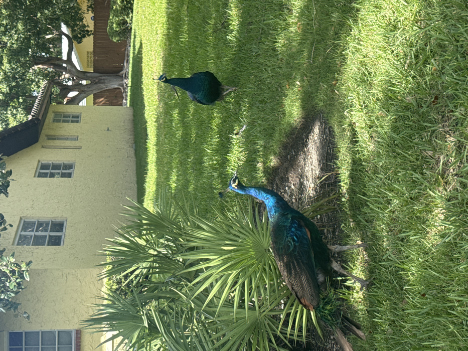 Two adult male Indian peafowl (Pavo cristatus) are present on a residential lawn in Palmetto Bay, United States