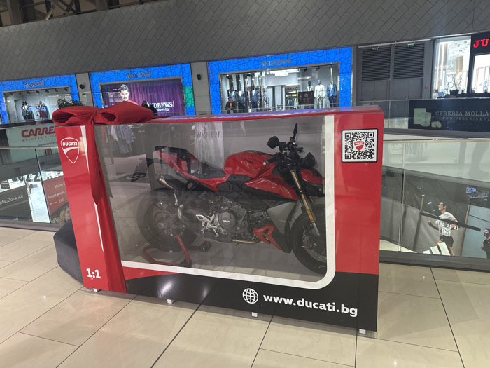 - "The image displays a full-size red Ducati motorcycle contained within a large, transparent, gift-box-style display case positioned on the light-tiled floor of a multi-level shopping mall in Sofia, Bulgaria" by FM-Eq6832, licensed under CC BY 4.0