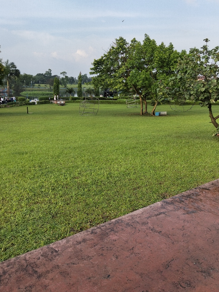 Lush green lawn stretches toward a distant tree line with a body of water visible. Several trees are interspersed throughout the lawn, with some metal structures beneath them. The foreground features a section of red-brown pavement. The scene is bathed in daylight under a lightly clouded sky, and there appears to be a bird flying in the distance.