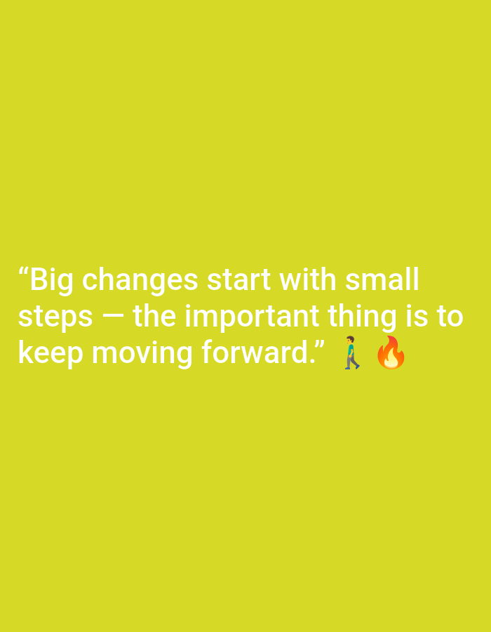 This digital image, contextually situated in Orizari, Bulgaria, features a solid, uniform yellow background. Prominently displayed in the lower-middle section is a motivational quote in white sans-serif typeface: "Big changes start with small steps β the important thing is to keep moving forward." Following the quotation mark, a walking person emoji (πΆββοΈ) is present, immediately succeeded by a flame emoji (π₯). The scene contains no discernible physical environment, people, or other objects.