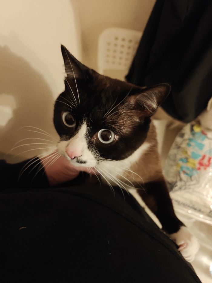 - "A medium-close shot features a Siamese cat with dark brown fur on its head and a white patch on its face, including a pink nose" by FM-eMutn2, licensed under CC BY 4.0